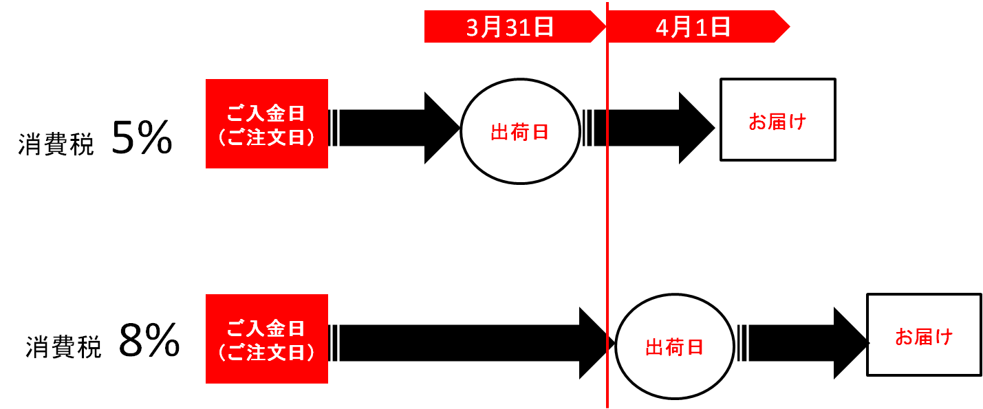 2014年4月1日より、消費税が5%から8%に変更となります。それに伴い、出荷日によって以下の通り税率が適用されます。