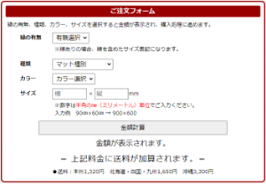 ご注文フォームに必要事項をご入力いただき、「金額計算」ボタンをクリックすると自動計算にて商品代金が表示されます。表示内容に問題がなければ、金額の下部にある「選択する」ボタンをクリックで入力内容の確認へ進みます。 |