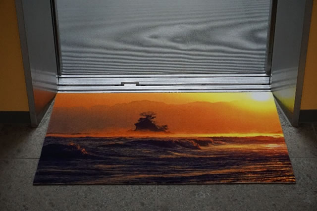 既存のタイルカーペットの一部に施設内の案内をプリントしたものを作られました。そして、往来の多い出入口には耐久性を重視した玄関マットを、エレベーターの前には日の出の写真を綺麗に再現できるフルカラーマットをご注文されました。
