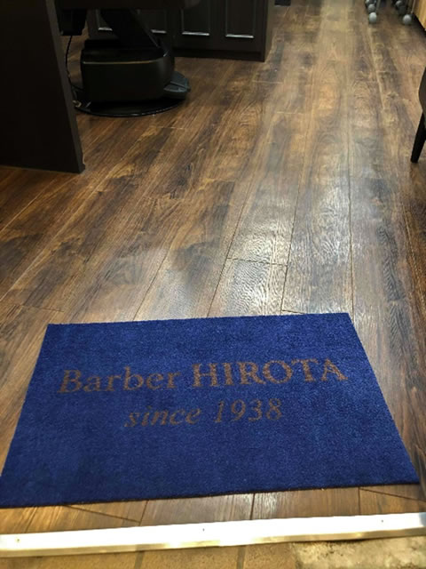 理容室のカードにプリントされているロゴをゴムの縁がない玄関マットにそのまま入れたいというご希望でした。マットの色番号をご指定いただき、クールでかっこいい仕上がりです。