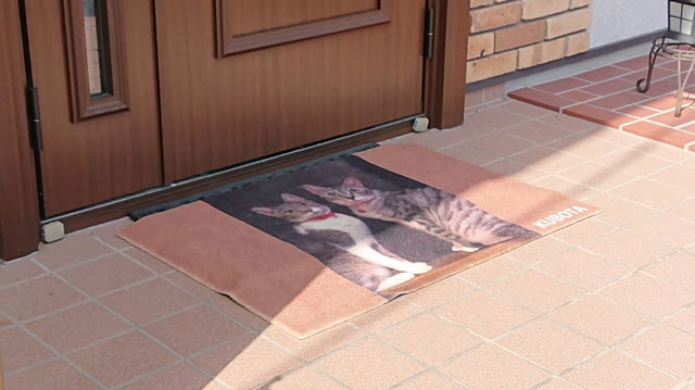 中央に大きくロゴを入れたデザインと猫の写真を使った2種類のフルカラーマットお作りしました。写真を玄関マットにしたい場合は、フルカラーマットをおススメしています。