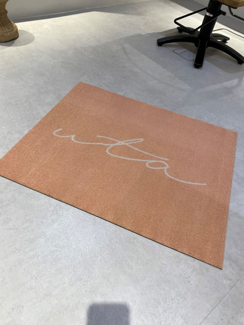 ヘアサロンのオープンに伴い、縁なしの玄関マットをご注文いただきました。ベージュに白抜きのロゴが優しい印象です。