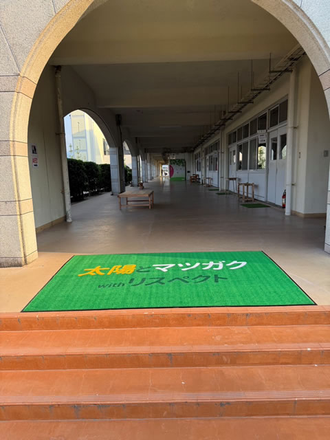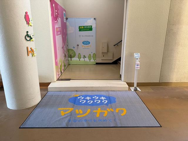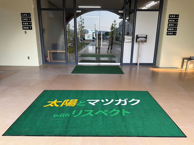 松山学院高等学校様より2400×1500㎜の大きな玄関マットをデザイン違いで計3枚ご依頼いただきました。どのデザインもそれぞれ素敵な仕上がりです。大判のマットは存在感があり、マットを敷くことで出入り口が分かりやすく明るい印象になりますね。